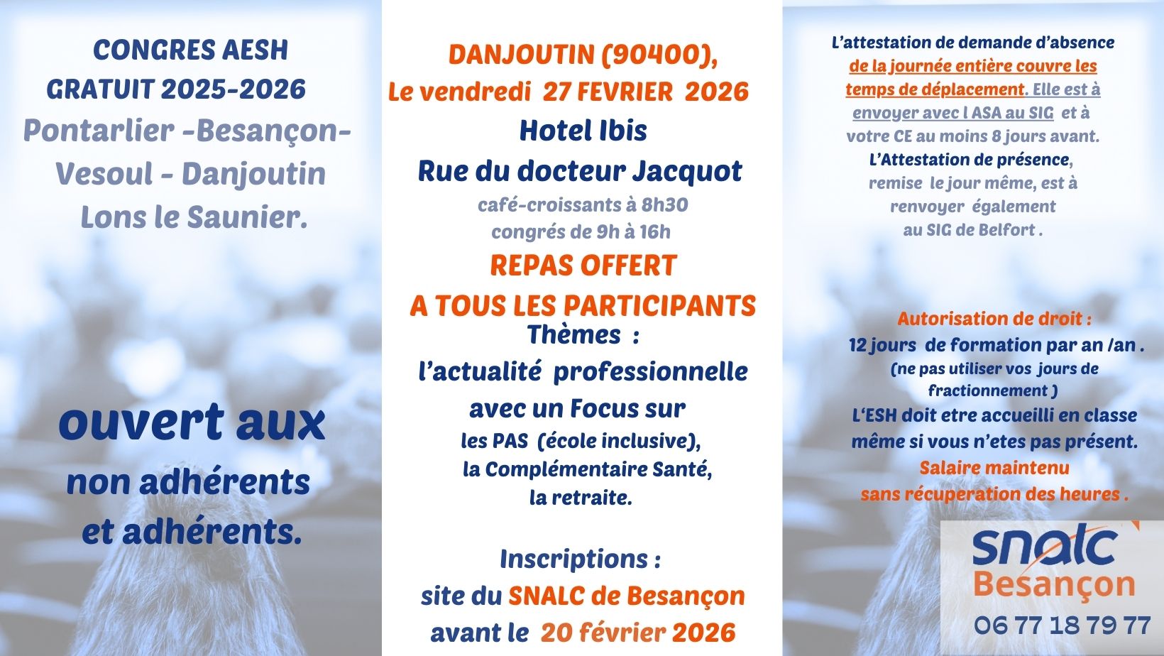 Le SNALC Besançon et Luce MARTIN vous proposent un premier congrès pour les AESH Le vendredi 23 janvier 2026 à l’hôtel Ibis 8, rue du